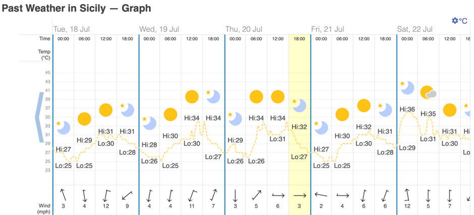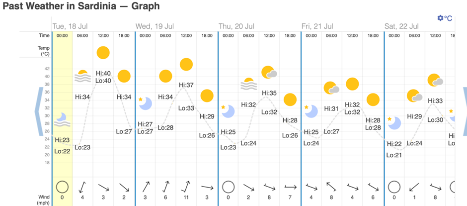Time and Date compiles comprehensive records of past temperatures, an increasingly useful tool for checking up on ‘World on Fire’ fantasists. The graph above shows the temperature in Sardinia peaking at 40°C on July 18th and then steadily falling during the week to the lower 30s.