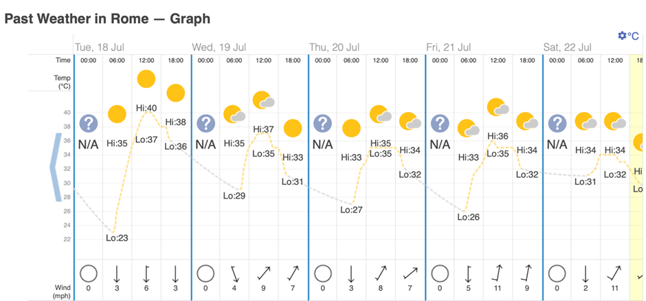 Also on July 18th the BBC reported that the temperature in Rome could reach 40°C and remain above that level for 15 days. Over to Time and Date again.