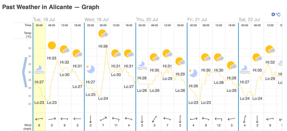 Alas, for our intrepid William Boot, it only briefly touched 33°C that day, and by the weekend the temperature in Alicante was struggling to stay in the 30s.