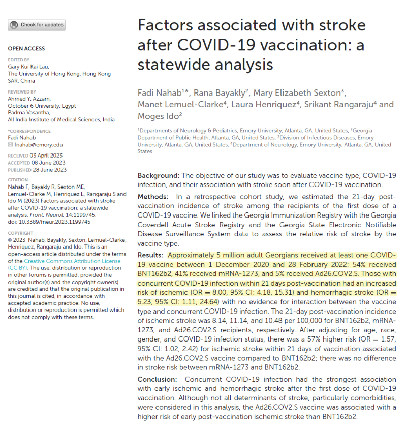 Nahab and coworkers from Emory analysed a statewide database of COVID-19 vaccine recipients. Approximately five million adult Georgians received at least one COVID-19 vaccine between December 2020 and March 2022: 54% received BNT162b2 [Pfizer], 41% received mRNA-1273 [Moderna], and 5% received Ad26.COV2.S [J&J]. Those with concurrent COVID-19 infection within 21 days post-vaccination had an [eight times] increased risk of ischaemic (OR = 8.00, 95% CI: 4.18, 15.31) and [a five times increased risk of] haemorrhagic stroke (OR =5.23, 95% CI: 1.11, 24.64).