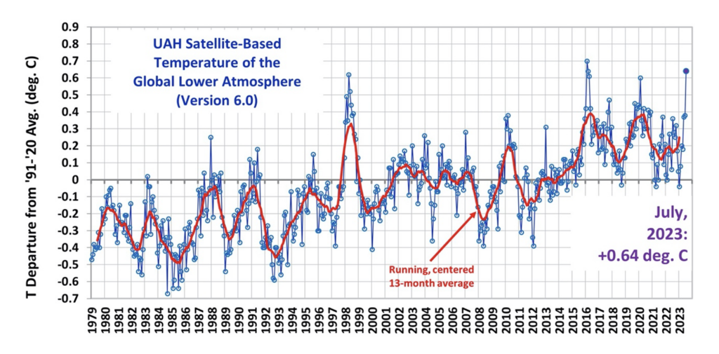 -” July 2023 was NOT the warmest month on the satellite record… an honor still held by February 2016. – July 2023 was about as warm as April 1998”. They are misleading us even by their own data, and their own data is junk.