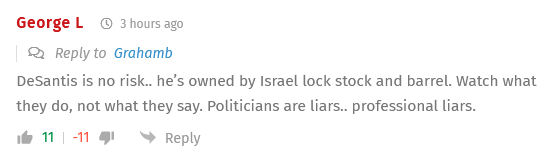 DeSantis is no risk.. he’s owned by Israel lock stock and barrel. Watch what they do, not what they say. Politicians are liars.. professional liars.
