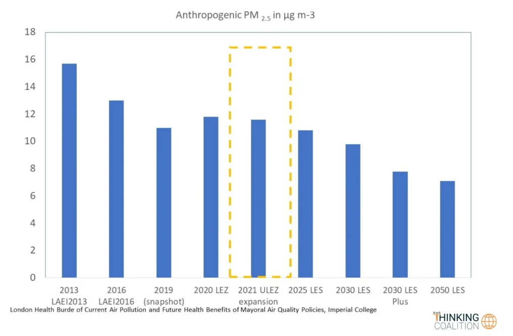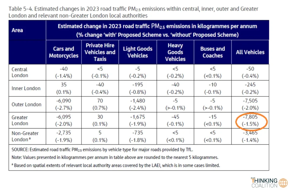 There is a slightly better outcome for NOx pollutants which are reduced by 5.4% across Greater London. This feeds in to the health impact assessment which unsurprisingly shows near zero benefit from Ulez for PM 2.5 reductions, for most health-related metrics.