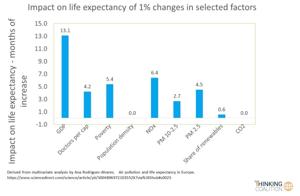 In order to get a handle on how much more significant factors other than PM 2.5 can be, we looked at a recent paper that considers the impact of changes in different factors on life expectancy across 29 European countries (the paper also looks at each factor in isolation using multivariate analysis). The chart below shows the life expectancy impact of a 1% change in the listed factors. There are of course some caveats, but you can immediately see that economic activity dominates the outcomes with a 13-month gain in life expectancy for a 1% gain in GDP versus say a 2.7 month gain for a 1% change in PM 10-2.5. Also note there is no statistically significant relationship between CO2 and life expectancy.