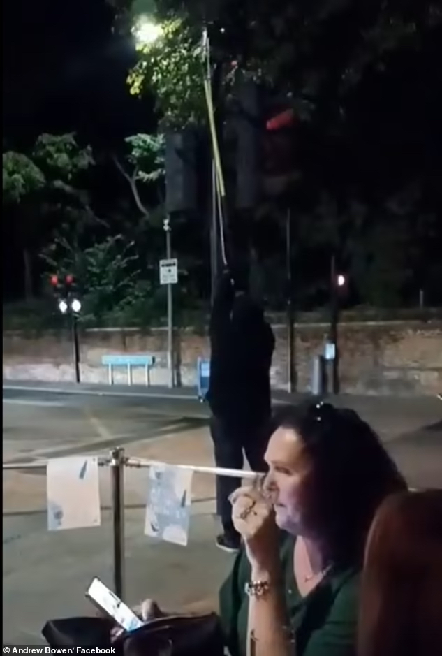 One woman smoking a cigarette looks around at the dark-clothed figure before carrying on with her conversation, while a bearded man with sunglasses on his head films the vandalism on his phone. …