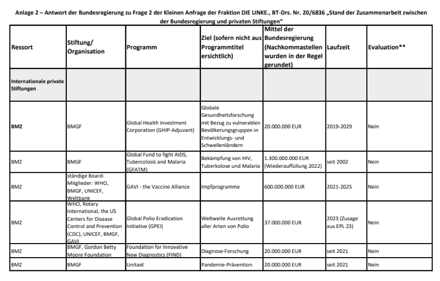 Furthermore, although the correct sum is far more imposing, it needs to be stressed that the funding in question is not in fact funding of Gates Foundation projects or programmes per se, but rather German co-funding of projects or programmes in which the Gates Foundation is also involved.