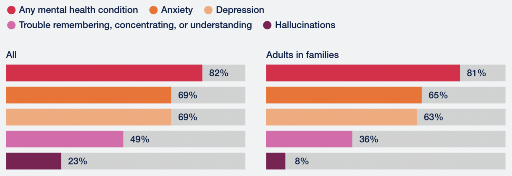 Remarkably, 82% of the homeless people in their sample said they’d had a mental health condition, and almost 1 in 4 said they’d had hallucinations (which are indicative of serious conditions like schizophrenia and borderline personality disorder). By contrast, the lifetime prevalence of any mental condition in the general population is only 46%.