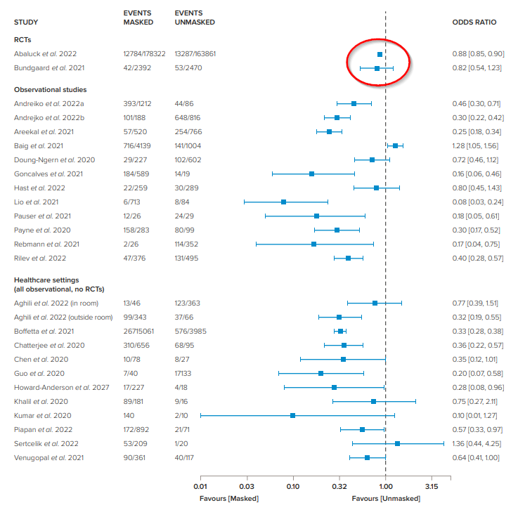 Here’s the summary diagram from the report. I have circled the two gold-standard RCTs that show zero or near-zero significant effect. Note that the Abaluck Bangladesh study which found a small (12%) reduction in infections has been heavily criticised for its methodology, and in any case it found the effectiveness of cloth masks to be around zero. The rest of the studies were observational and at “critical risk of bias”, and so can tell us little of value.