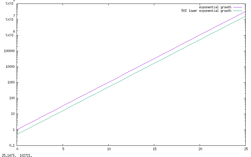 Poor old Ferguson and his gang of Experts Of The Science™ still cannot do basic math. The attached image shows exponential growth of something at a rate and at half the rate. As is clearly visible this make f*** all of a difference, it basically means apocalypse today for for full rate, apocalypse tomorrow for half rate (or whatever the base time interval happens to be).