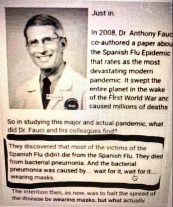 Fauci explained it in an interview, and it ought to be obvious to everyone by now: the point of the masks (and the lockdowns and everything else) is to make people think there is a reason for these things; a reason to be afraid, and to get them to take the ‘vaccines’ to get out of the trap. That’s the only reason for any of this covid theatre. There was never anything to be scared of. It’s a hoax. It was engineered to get as many people as possible to have themselves repeatedly injected with poison.