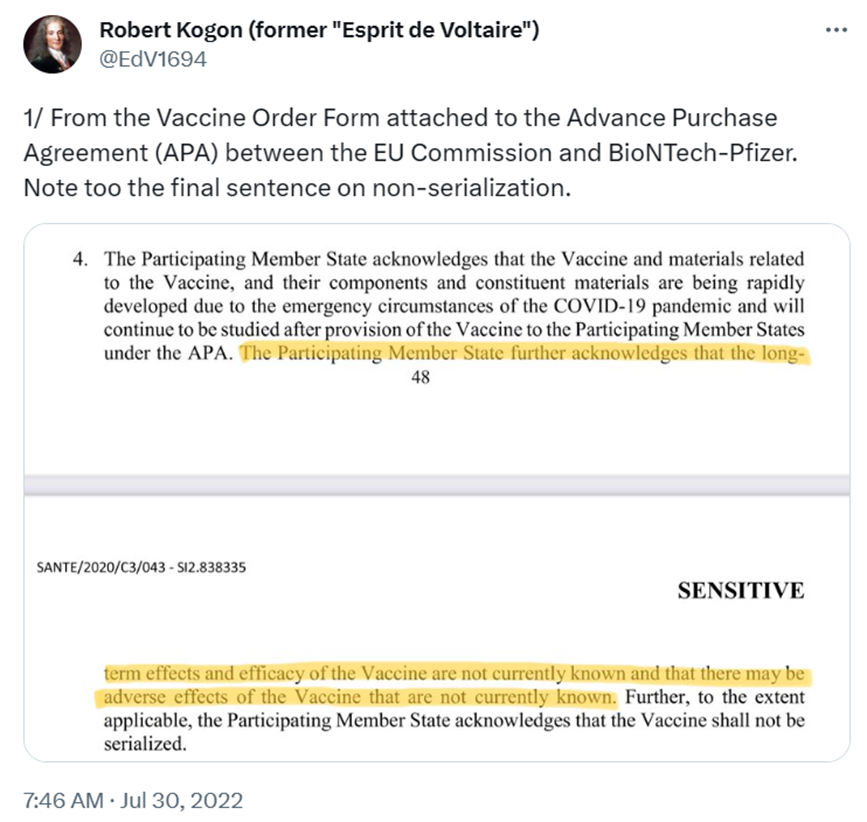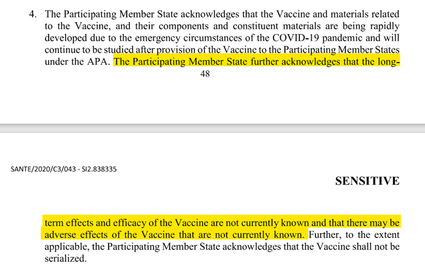 Consider, for instance, the following clause from Article 1, paragraph 4, of the Vaccine Order Form which is appended to the APA: “The Participating Member State further acknowledges that the long-term effects and efficacy of the Vaccine are not currently known and that there may be adverse effects of the Vaccine that are not currently known.” (See full paragraph below.) How many Europeans would have rushed to take the vaccine or even consented to take it if they had known that?