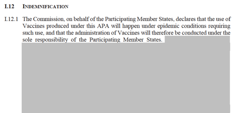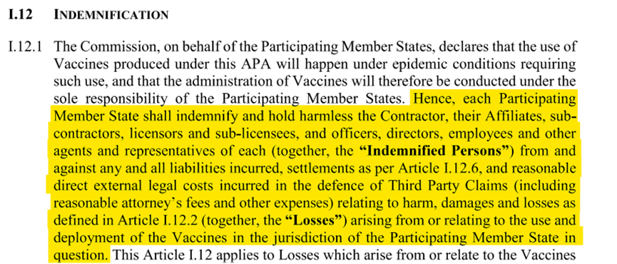 This ‘acknowledgement’ clause in the order form – acknowledgement, in effect, that the manufacturers knew neither if the vaccine was safe nor if it was effective, at any rate in the long-term – is in addition to the clauses which already provide the manufacturers extremely wide-reaching indemnification in the section on indemnification of the contract proper. See, for instance, the excerpt from Article I.12.1 below.