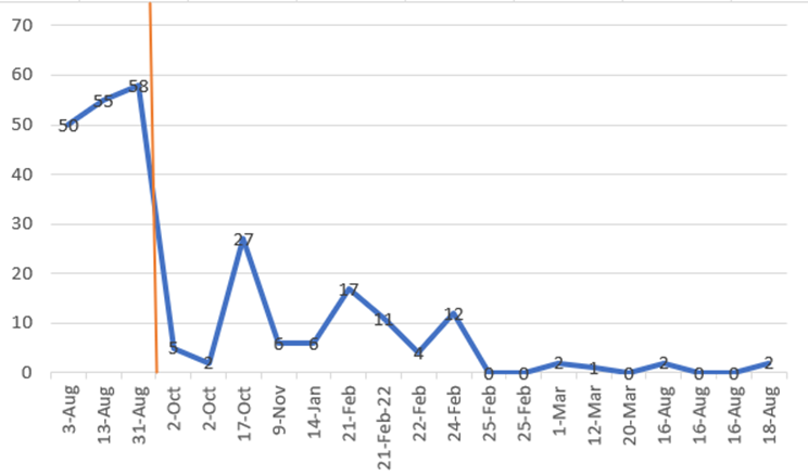 Thereafter, engagement with my reply-tweets quoting the thread plummeted in general, occasionally popping up again, but still to less than half the previous level, before trending down to essentially, and apparently permanently, non-existent under the new Twitter regime. The below graph of relevant engagement (likes plus retweets) before and after the date of the interaction with Terhes illustrates this. It only includes tweets in which I used the word ‘unredacted’.