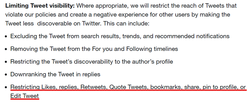 Restricting engagement remains very much a thing on the new Twitter/X, as X CEO Linda Yaccarino readily admits and as can be seen in the below extract on ‘tweet-level enforcement’ from the X ‘Help Centre’. Indeed, the actions taken to suppress tweet visibility appear to be more extensive now than under the old regime. (‘misleading’ tweets could be quoted, for instance.)