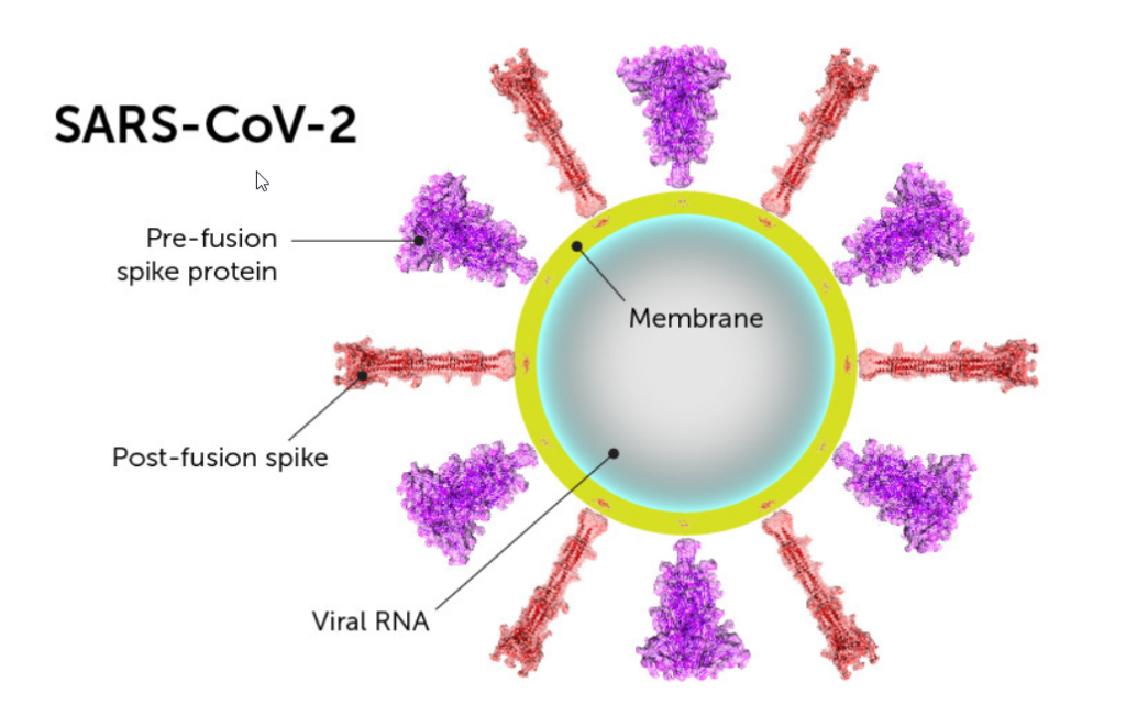 This picture explains the study design, showing the location of the “stabilized 2P spike protein” amino acid sequence: