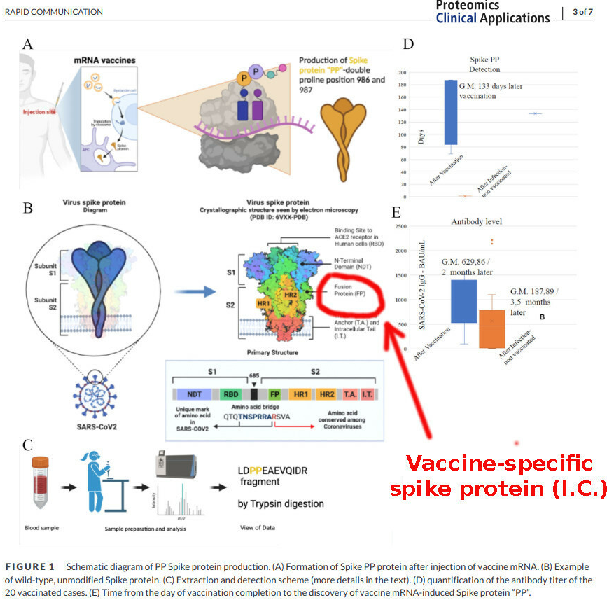 The replacement, using two proline amino acids, is referred to as ‘PP’ by the study authors (PP stands for proline-proline). They are Italian and possibly did not realise that ‘PP’ sounds naughty, so in most English literature the sequence is called ‘2P’. Leaving kindergarten humour aside, the study authors zero in on the spike protein component that only exists in the Covid vaccine and does not occur in the naturally existing SARS-CoV-2 virus.