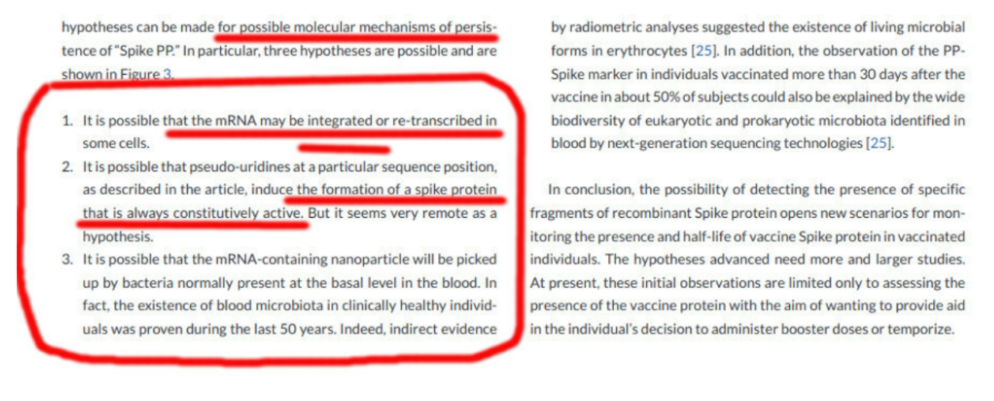 An item of note is the above sentence, “It is possible that the mRNA may be integrated or re-transcribed in some cells”. The so-called reverse transcription, that is, vaccine mRNA becoming part of the human DNA genome in some affected cells, was originally dismissed without evidence by the so-called ‘Covid science’, until it was demonstrated in in-vitro experiments.
