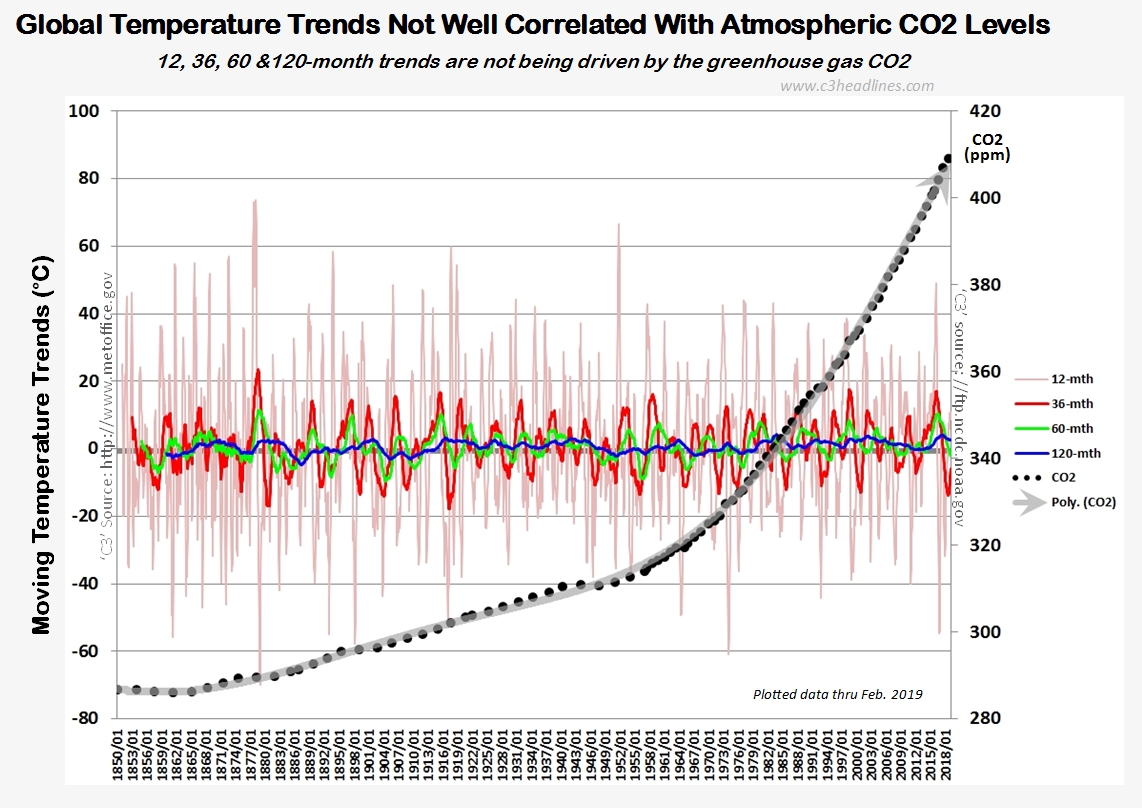 Anthropogenic climate change fails on almost every count. In particular, it cannot explain a vast body of observations available in the historic, near-historic and 600-million-year paleological record. In all that time, rarely do temperatures rise following rising carbon dioxide levels. In the near-historic period, ice core records going back about 500,000 years suggest that rising temperature preceded, and likely caused, CO2 levels to follow suit as natural processes such as ocean degassing come into play. Across the paleological period, CO2 levels have been up to 20 times higher with no evidence of a climate fireball. Over the last 120 years, temperatures have risen (1910-40, 1980-98), fallen (1940-75) and paused (2000-14, 2016-23), all at a time when CO2 showed a continuous rise.