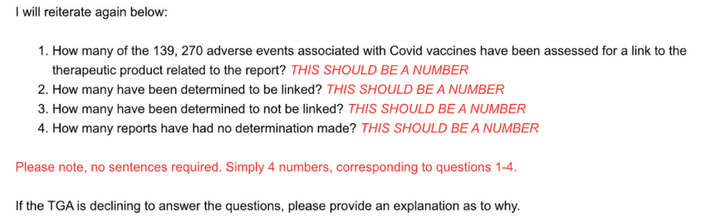 As the TGA failed to answer my specific questions, I went back a second time, asking, “How many AEs have you assessed and how many did you determine to be causally linked to the Covid vaccines?”
