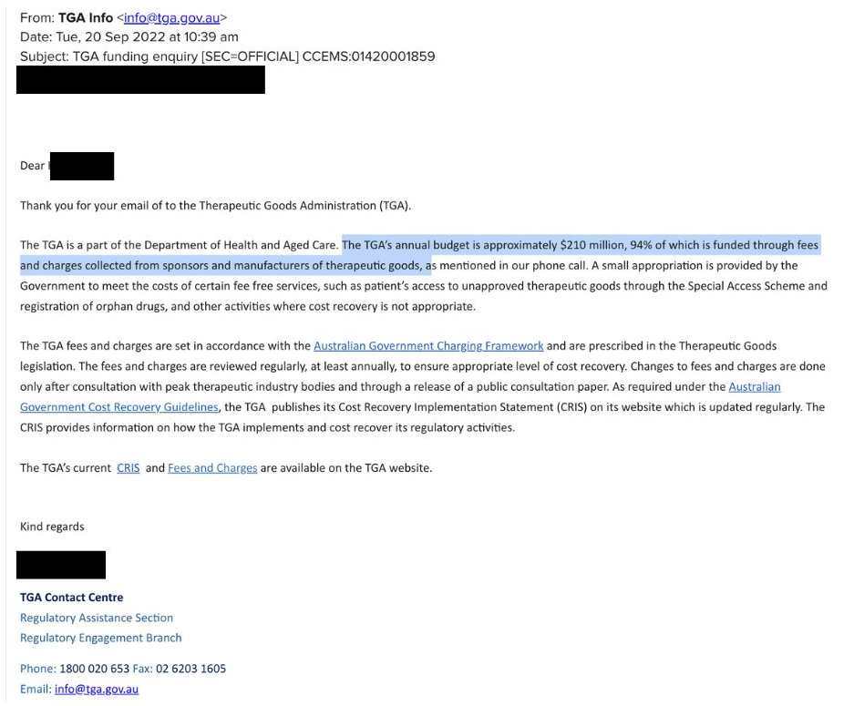 A much-cited investigation into drug regulator funding conducted by Maryanne Demasi for the British Medical Journal found that the TGA receives more industry funding than any other regulator in the world, at 96%. More than nine out of every 10 applications for new drugs are approved by the regulator.