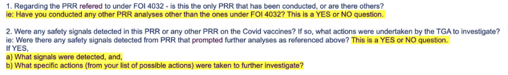 The TGA says that it constantly searches for safety signals, but refuses to say how often, by what methods, or to share what it has found when asked. Below is an excerpt from correspondence between myself and the TGA spanning several months, in which I asked a very specific set of questions about proportional reporting ratio (PRR) analysis. The TGA sent a paragraph in reply not answering the questions, and then a chain ensued with me reiterating my questions and the TGA reiterating the reply that didn’t answer the questions. Eventually, my request was denied both via media and Freedom of Information (FOI) processes.