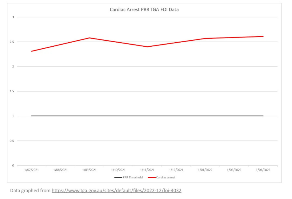 Former head of the TGA, Professor John Skerrit, denied that cardiac arrest is a safety signal for Covid vaccines. Yet here is the TGA’s own PRR data on cardiac arrest, graphed (FOI 4032). It shows a PRR of over 2, which is significant because it was decided at a meeting of the Advisory Committee for Vaccines in 2021 that any denominator over 1 would constitute a safety signal.