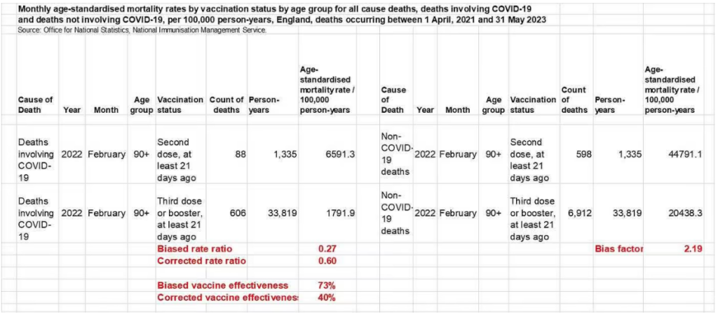 The example below shows that the rate of non-Covid mortality in the oldest recipients of only two doses was 2.19 times that rate in their age-matched counterparts who received three doses. Those who continued to take the booster were healthier on average. That’s the healthy vaccinee bias, which was present in every age group in every month. The ratio 2.19 is called the bias factor. Its value ranged from 2 to 5 in most of the ONS data I extracted. The lowest value was 1.7 and the highest was 8.1.