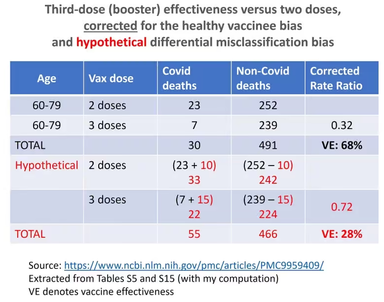 Suppose 5% of 491 non-Covid deaths in ages 60-79 were actually Covid deaths, which were misclassified (because physicians were convinced that the vaccines were highly effective and for other reasons). Nonetheless, there was differential misclassification as explained above: 6% of 239 non-Covid deaths in three-dose recipients (‘up to date’ vaccinated) were Covid deaths, whereas only 4% of 252 non-Covid deaths in two-dose recipients (‘unvaccinated’) were Covid deaths.