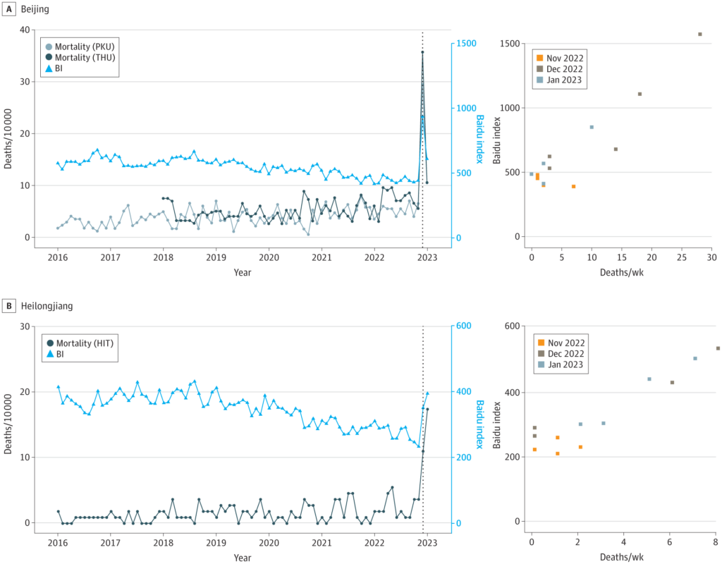 How did the researchers arrive at this figure? Their method was quite clever. Xiao and colleagues began by tracking the number of obituaries for three major universities: Peking University and Tsinghua University in Beijing, and Harbin Institute of Technology in Harbin. (The New York Times also used obituaries to show there was a spike in deaths around the time China abandoned zero-Covid.)