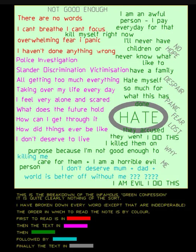 Much is a stream of fear and self-loathing but what’s critical is in green, bottom right, below the heavily encircled “HATE”. This reads: “They accused; they went…”, followed by those claimed confessions. “Accused” isn’t certain to me, being obscured by the heavy circle around “HATE”, but the meaning is clear from “They went”, which is to say that “They [the police] asserted that…”. Read that way, it’s a shell-shocked woman describing a police interview, not a confession.