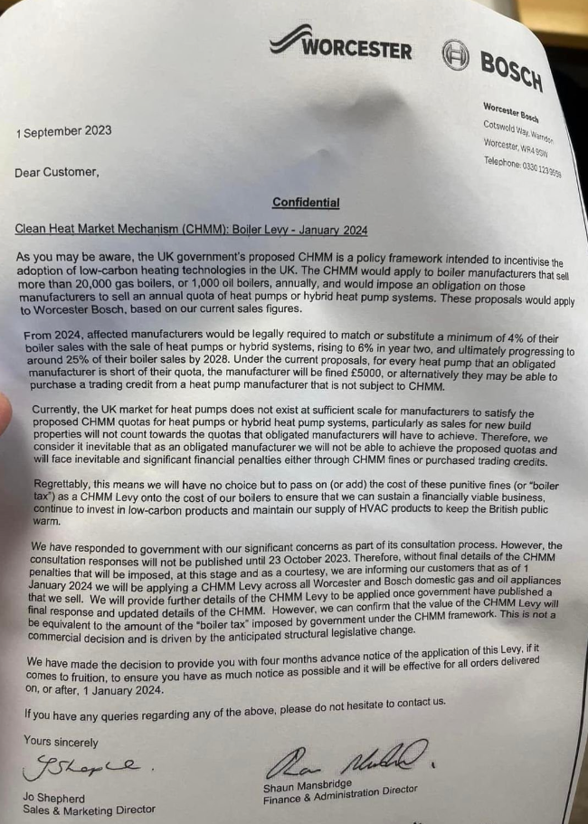 I have been a Heating Engineer for the last 25 years and am horrified at where our Uniparty politicians are taking us with their Carbon Net Zero lunacy. I have seen a memo from Worcester Bosch stating that it is going to be fined from 2024 if it sells more than 20,000 gas boilers or 1,000 oil boilers and as a result will have to pass the cost on to the consumer. I have completed a hydronics course and it is obvious that heat pumps are at best expensive and in a great many cases totally unsuitable for a lot of our housing stock. I can already see a situation where I attend a boiler breakdown and find that the boiler can’t be repaired and with this new legislation that the customer won’t be able to afford a new boiler or a heat pump and will be left with no heating or hot water.