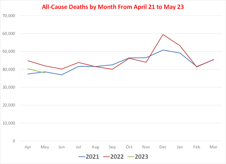 Let’s start with all-cause deaths of all people in England over 18 years of age by month from April 2021 to the end of May 2023, as shown in Figure 1.