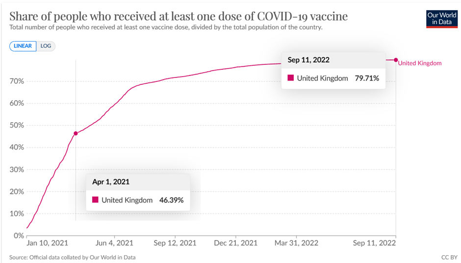Let’s also just look at the overall situation with regards to vaccination. Bearing in mind that as no one knows how many people live in the U.K., the absolute accuracy of the percentage of the population vaccinated will be an approximation. Our World in Data estimated the level to be about 80% back in September 2022; it hasn’t changed a lot since then. When the ONS data series started in April 2021, the ONS estimates about 46% had had at least one dose. These would nearly all have been elderly and vulnerable people,