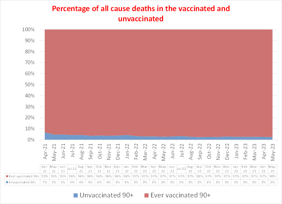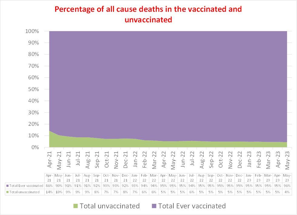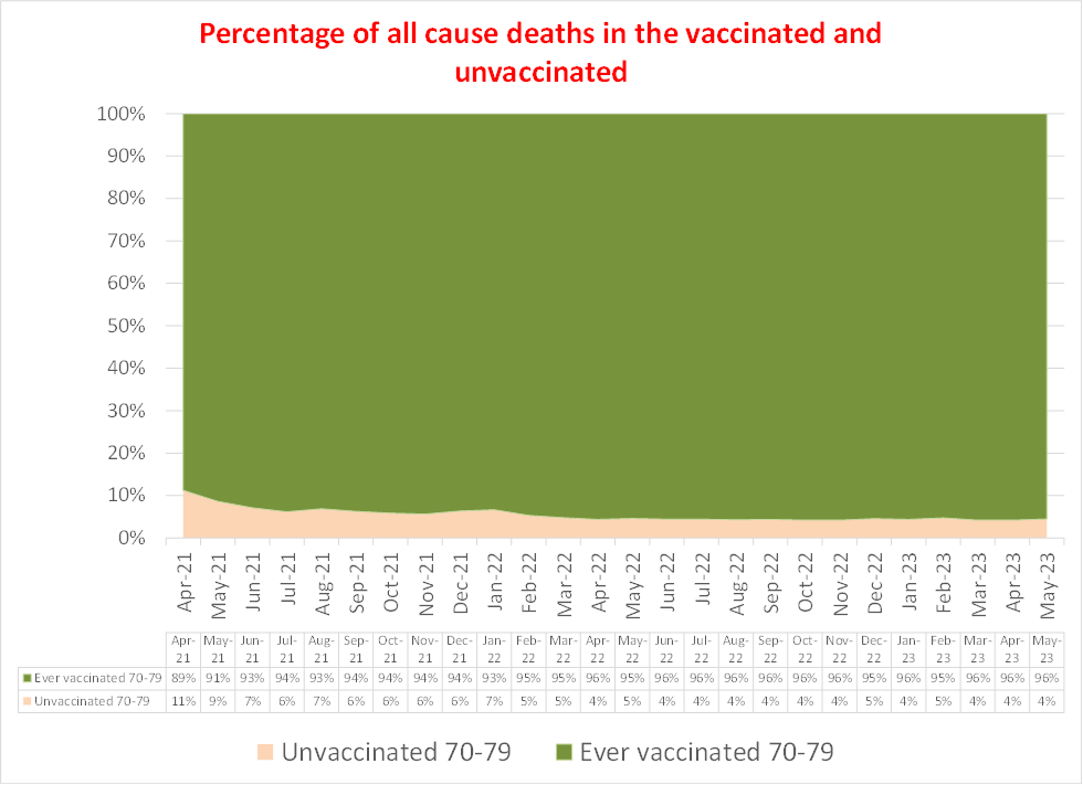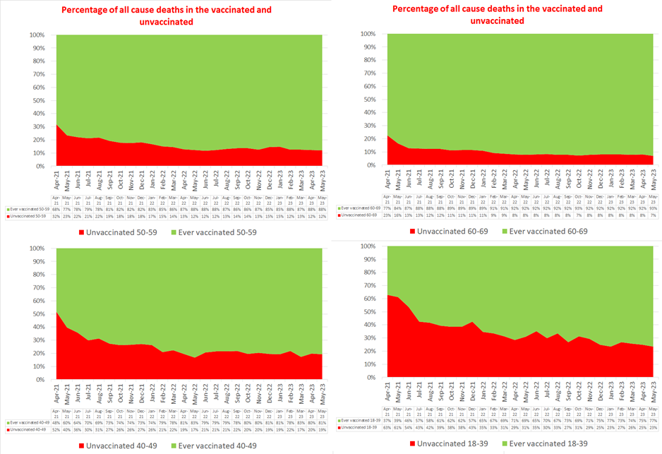 The data in the charts above are the raw data, not age-adjusted or weighted, and they tell me that just 4% of all deaths in May 2023 were of unvaccinated people. Do I think the unvaccinated are at any more risk than the vaccinated? No. But I’m not so sure the other way round.