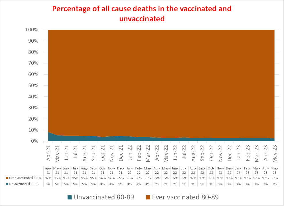 The picture is much the same among the 80-89 year-olds. Since May 2021, deaths of the unvaccinated have never been above 5%, levelling off at 3% since April 2022.