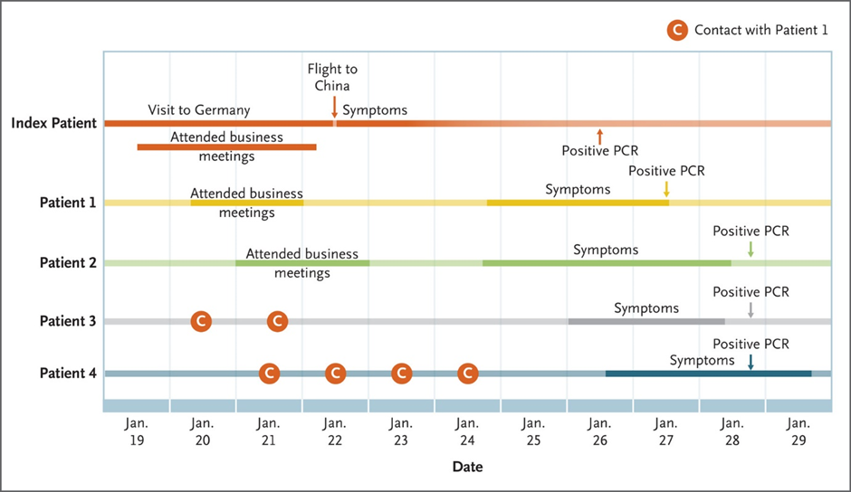 So, not only was Germany’s “asymptomatic” Patient Zero not in fact asymptomatic, as originally claimed by Rothe et al. Closer inspection of the timeline of her illness published by Rothe et al., apparently in an effort to salvage the German group’s original claim, raises still more troubling questions: who, after all, was Patient Zero and who was Patient One? Who infected whom? Or were their illnesses even related at all?