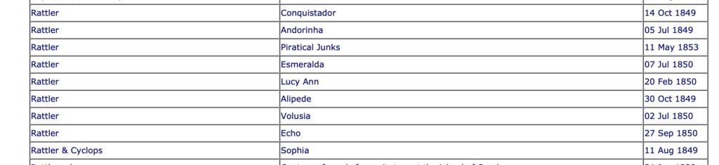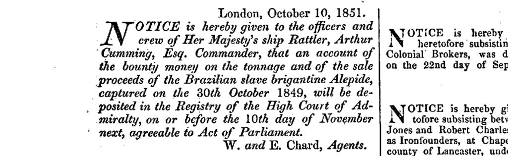 The screengrab above is from a remarkable list of “about 2,428 Slave Trade Vessels detained by RN Vessels &c” between about 1810-60, Rattler’s being mainly Brazilian-flagged slavers in the Bight of Benin (the “piratical junks” listed were from a later action with the East Indies fleet). The Alipede appeared, though misspelt as Alepide, in the London Gazette (October 11th 1851). Her master had been Antonio Cipro da Sa Bittencourt, she displaced a modest 90 tons, and after being judged at court in Sierra Leone to have been “equipped for Slave Trade” Alipede was forfeited and condemned to be broken up.