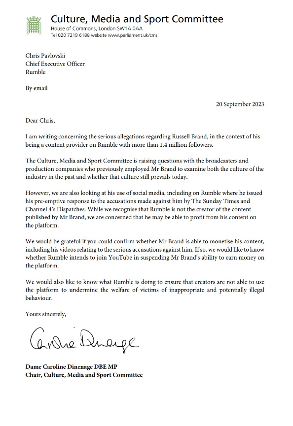 In a letter which has sparked uproar on social media, Dame Caroline asked Rumble: “We would be grateful if you could confirm whether Mr. Brand is able to monetise his content, including his videos relating to the serious accusations against him.