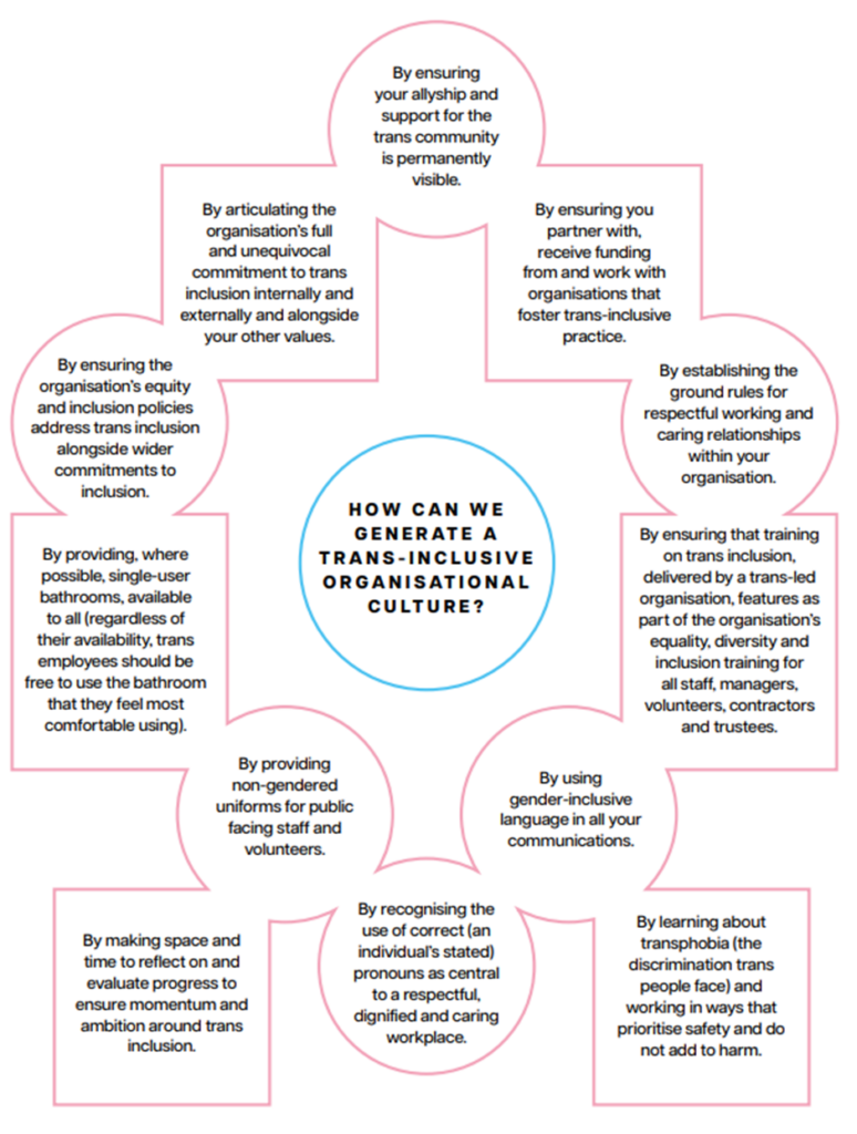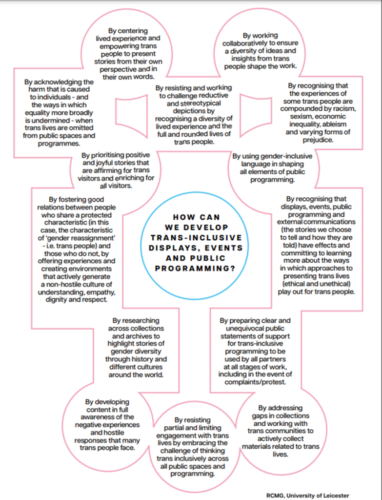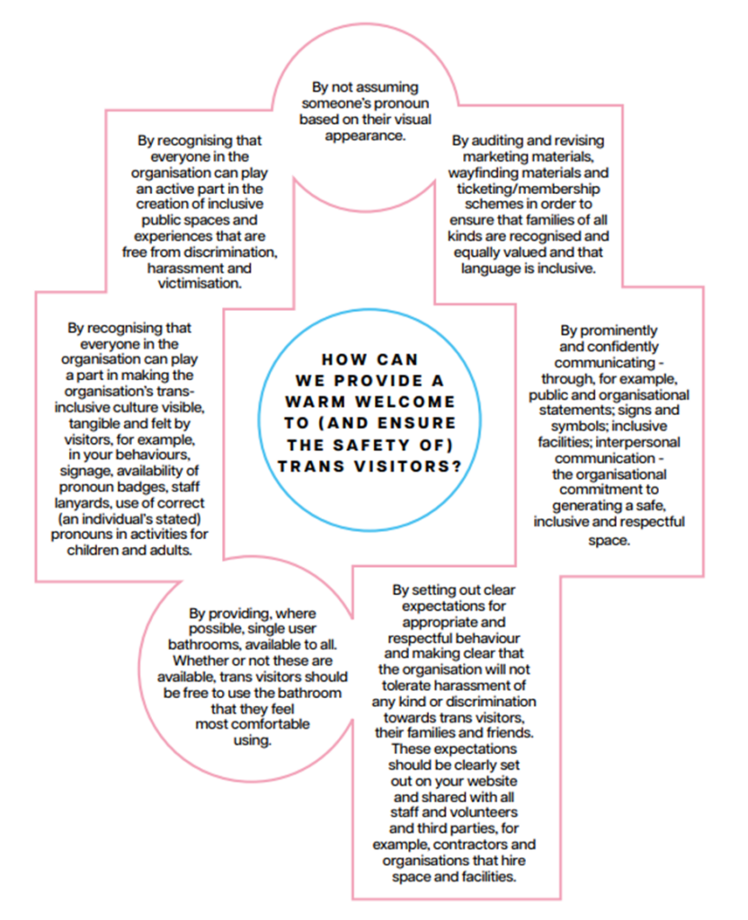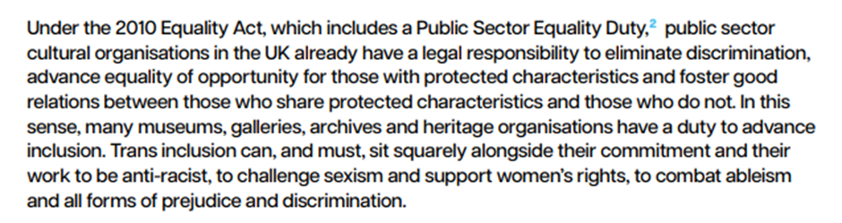 This allows cultural organisations to be proactive in publicly promoting trans-inclusive environments. Organisations such as museums that are not trans-inclusive could be discriminating against individual staff and customers, and creating a trans-inclusive organisation (for example, by adopting trans-inclusive policies and guidance that cover harassment and bullying against trans people) does not conflict with equality duties to prevent discrimination against (or foster inclusiveness for) any other protected characteristic group.