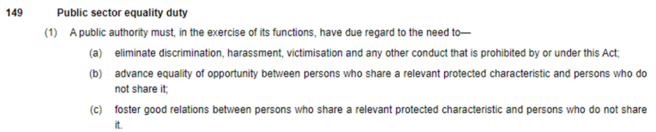 As the trans museum guidance explains, the Equality Act 2010 contains a “Public Sector Equality Duty” (PSED) at section 149. This is how the guidance explains and interprets it: