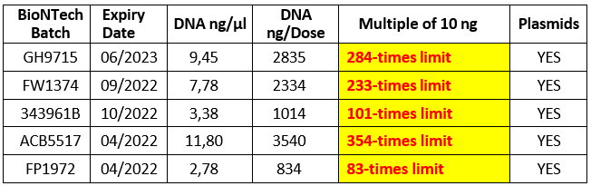 The table is adapted from Kirchner’s August 9th letter to the German regulator, the Paul Ehrlich Institute (PEI), calling for “the immediate withdrawal of BioNTech’s Comirnaty mRNA vaccine from the market” on account of the DNA contamination. (The letter is attached to Kirchner’s September 16th letter to German Minister of Health Karl Lauterbach, which is available here.)