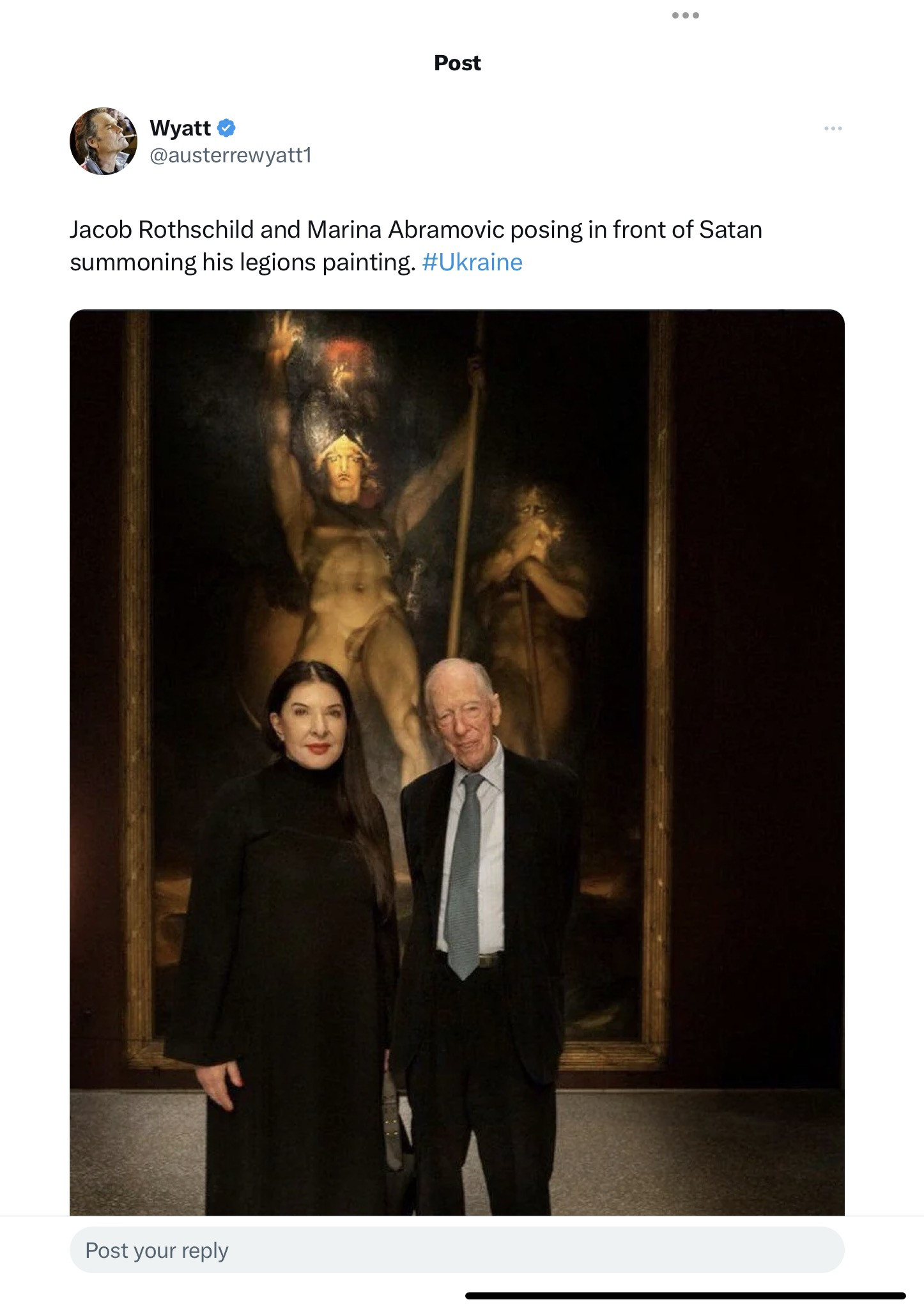 If Rothschild is bothered about anti-semitic conspiracy theorist rumours that he is an evil puppeteer ruling the world – probably best not to get photographed in front of a painting titled “Satan Summoning his Legions” with a self proclaimed dark magic witch!!!