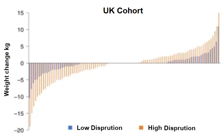 Figure 2 shows the impact on weight. With over 200,000 participants this was a huge study. Participants were divided into two groups: low DI and high DI. DI stands for ‘disruption index’; it indicates the degree to which someone’s lifestyle was impacted by the lockdown.