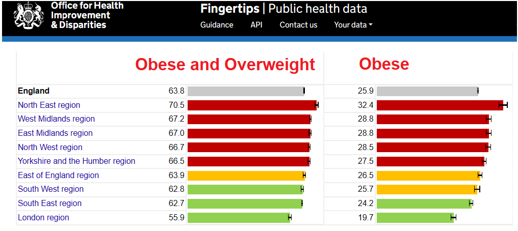 It’s perhaps worth just reminding ourselves of the degree to which the U.K. has become a nation of fatties. Figure 3 shows the proportion of overweight and obese over 18 years-olds by English region.