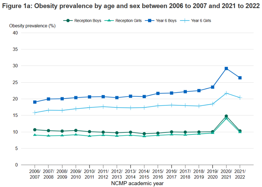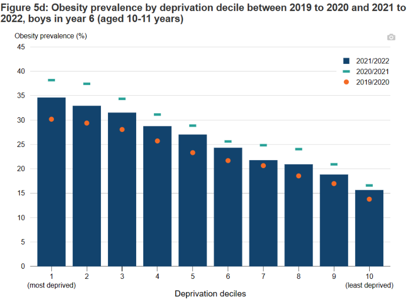 Figure 4 illustrates the degree to which reception age and year 6 boys and girls saw obesity levels accelerate dramatically in 2020-21. While the ‘reception age’ kids’ mean weight went back to its pre-pandemic levels the mean weight for year 6 kids didn’t, showing about a three percentage point increase.