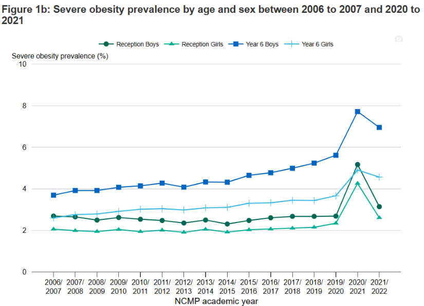 Among the ‘severely obese’, the impact of the lockdowns is even more dramatic, as shown in figure 5. Among year 6 boys there’s been an increase of about a a third in the number of the severely obese.