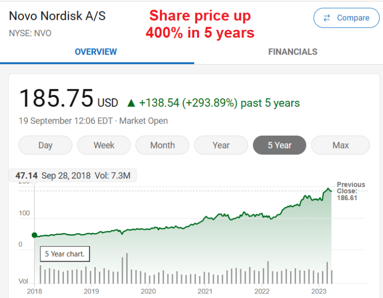 Wegovy is made by pharmaceutical company Novo Nordisk. Its share price has doubled in the last 12 months and went up 400% over the past five years. It’s been a good time to be big in obesity!