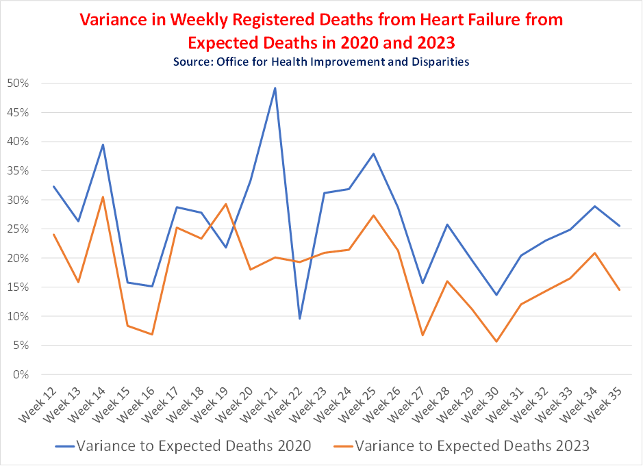 However, it doesn’t report it in quite the same way. It compares heart failure deaths in 2023 with ‘expected’ heart failure deaths for 2023, without mentioning that ‘expected’ heart failure deaths in 2023 are 8% higher than in 2020. Inflation affects heart failure deaths just as much as it does the pound in your pocket, it seems!