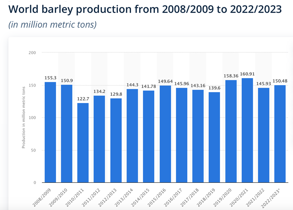 A great deal of barley ends up with brewers, and with important sectors like beer considered a mature business, with steady rather than spectacular growth, the demand for the grain is fairly constant. Like all harvests it can be affected by local weather conditions but the Statistica graph above shows a steady trend with 2020-21 posting a record total of 160.91 million metric tons. If there are to be dramatic shortages in barley going forward due to climate change, they have yet to show up in the production record. Meanwhile, the situation in Ukraine is of particular concern since it is one of the world’s top producers of the crop.