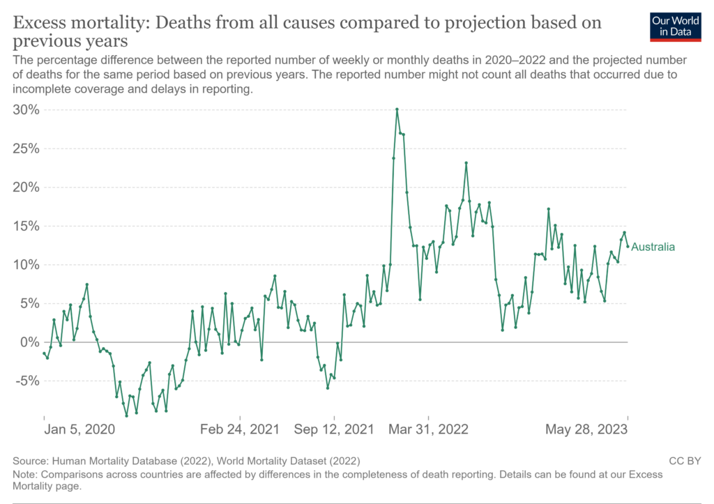 Towards the end of last year, Australia’s top actuarial body said the “incredibly high” excess deaths in 2022 – 17% above the pre-pandemic average in the first eight months of the year – which were observed across the country including in Victoria, should be urgently investigated by the Government. Australian mortality has been well above average since autumn 2021.